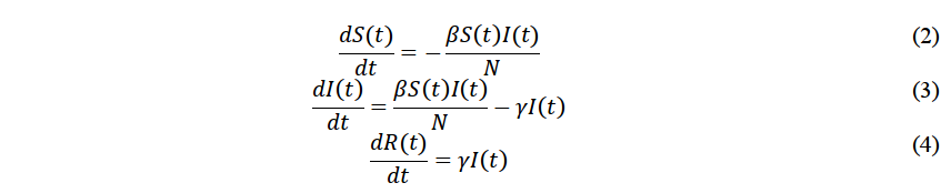 where the constants β, γ, N represent the infection rate, recovery rate, and the total number of people, respectively. This model considers the total population is susceptible to contracting this disease S(t), and only a fraction can be infected, I(t) according to infection rate defined by β. Finally, the population recovers, R(t), at a recovered rate given by γ; with the condition that